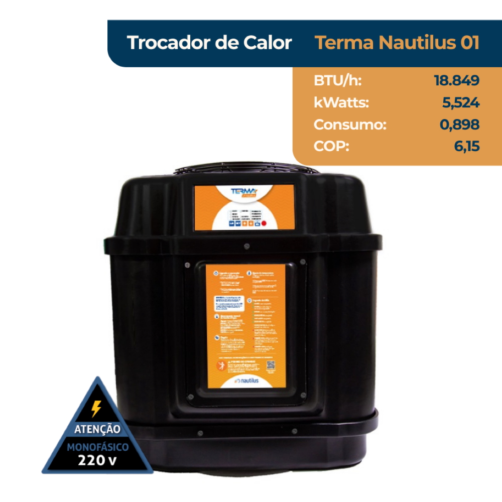 A Bomba de calor Nautilus TERMA NAUTILUS 01 conta com ventilador de baixo nível de ruídos, sistema de degelo a ar de série, é de fácil instalação e operação. Seu painel digital tem sinalização de falhas protegendo o equipamento de danos. Pode ser instalado em conjunto com qualquer tipo de tratamento químico da água (gerador de cloro, ozonizador etc.), sem acarretar na perda da garantia. Além disso, a Bomba de calor Nautilus TERMA NAUTILUS é sinônimo de segurança, pois possui condensador de titânio que é resistente e isolado eletricamente e não permite a passagem de corrente elétrica para a água. Como opcionais, o produto oferece o sistema de degelo a gás quente e o sistema de comando a distância (sem fio até 10m, com fio até 1000m) e display LCD com calendarização para o aquecimento e automatização da filtração.