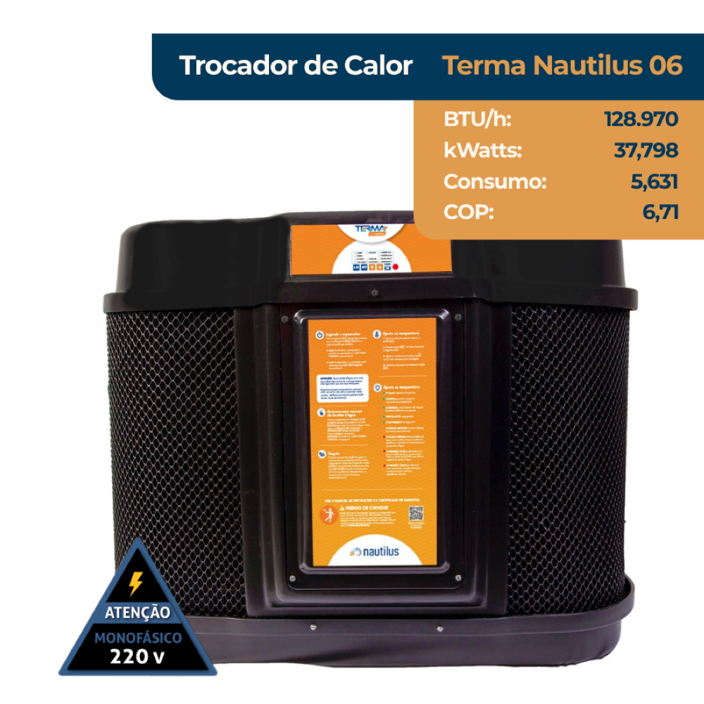A Bomba de calor Nautilus TERMA NAUTILUS 06 conta com ventilador de baixo nível de ruídos, sistema de degelo a ar de série, é de fácil instalação e operação. Seu painel digital tem sinalização de falhas protegendo o equipamento de danos. Pode ser instalado em conjunto com qualquer tipo de tratamento químico da água (gerador de cloro, ozonizador etc.), sem acarretar na perda da garantia. Além disso, a Bomba de calor Nautilus TERMA NAUTILUS é sinônimo de segurança, pois possui condensador de titânio que é resistente e isolado eletricamente e não permite a passagem de corrente elétrica para a água. Como opcionais, o produto oferece o sistema de degelo a gás quente e o sistema de comando a distância (sem fio até 10m, com fio até 1000m) e display LCD com calendarização para o aquecimento e automatização da filtração.