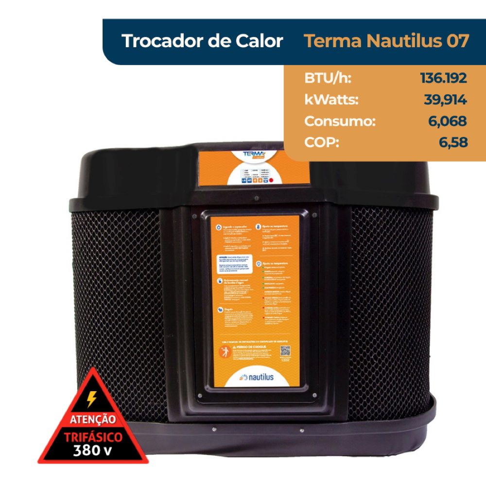 A Bomba de calor Nautilus TERMA NAUTILUS 07 conta com ventilador de baixo nível de ruídos, sistema de degelo a ar de série, é de fácil instalação e operação. Seu painel digital tem sinalização de falhas protegendo o equipamento de danos. Pode ser instalado em conjunto com qualquer tipo de tratamento químico da água (gerador de cloro, ozonizador etc.), sem acarretar na perda da garantia. Além disso, a Bomba de calor Nautilus TERMA NAUTILUS é sinônimo de segurança, pois possui condensador de titânio que é resistente e isolado eletricamente e não permite a passagem de corrente elétrica para a água. Como opcionais, o produto oferece o sistema de degelo a gás quente e o sistema de comando a distância (sem fio até 10m, com fio até 1000m) e display LCD com calendarização para o aquecimento e automatização da filtração.