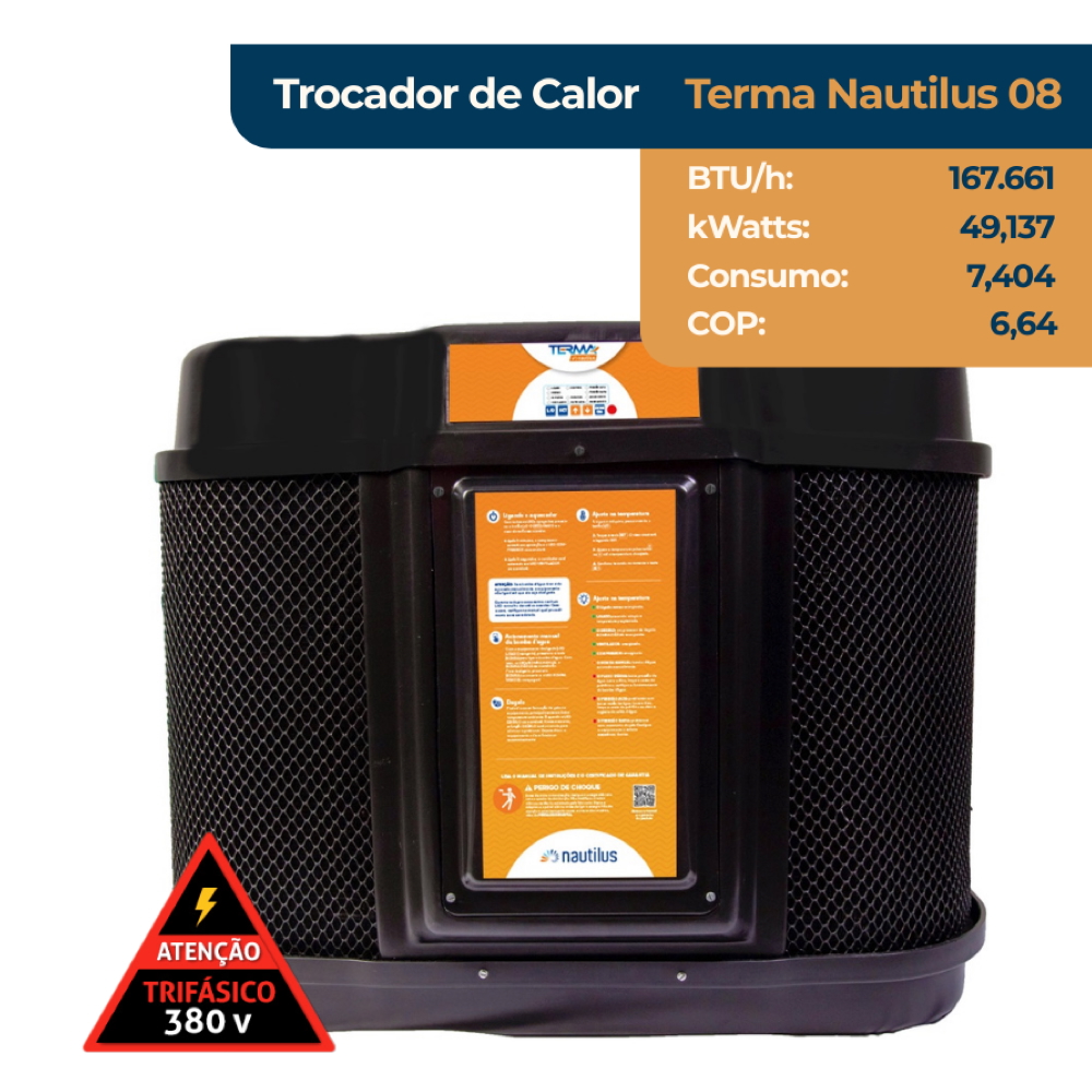 A Bomba de calor Nautilus TERMA NAUTILUS 08 é indicado para piscinas residenciais ou comerciais.