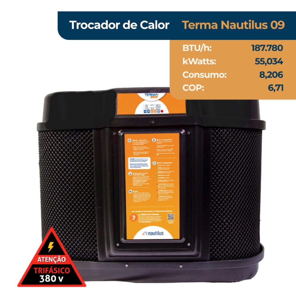 A Bomba de calor Nautilus TERMA NAUTILUS 09 conta com ventilador de baixo nível de ruídos, sistema de degelo a ar de série, é de fácil instalação e operação. Seu painel digital tem sinalização de falhas protegendo o equipamento de danos. Pode ser instalado em conjunto com qualquer tipo de tratamento químico da água (gerador de cloro, ozonizador etc.), sem acarretar na perda da garantia. Além disso, a Bomba de calor Nautilus TERMA NAUTILUS é sinônimo de segurança, pois possui condensador de titânio que é resistente e isolado eletricamente e não permite a passagem de corrente elétrica para a água. Como opcionais, o produto oferece o sistema de degelo a gás quente e o sistema de comando a distância (sem fio até 10m, com fio até 1000m) e display LCD com calendarização para o aquecimento e automatização da filtração.