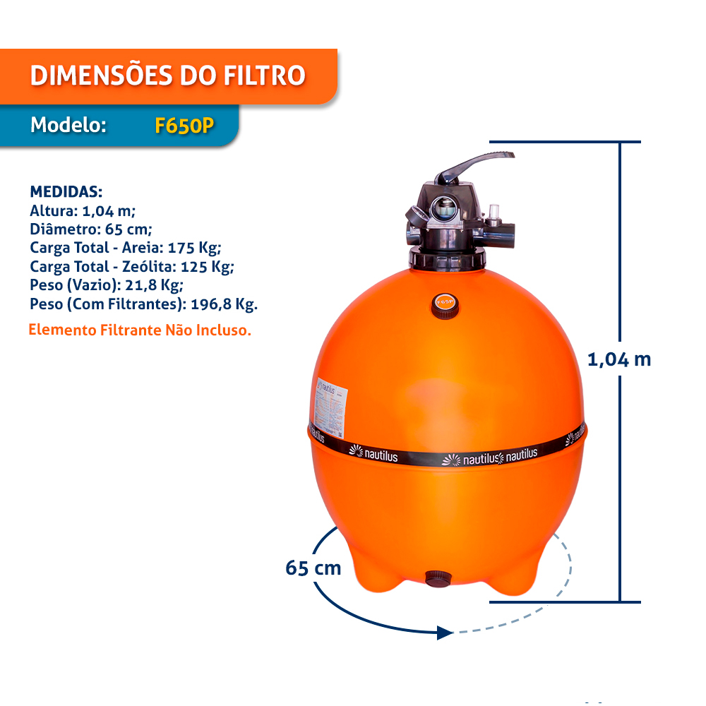 O filtro Nautilus para piscina F650P é um filtro de alta eficiência, ideal para a limpeza de piscinas de até 109.000 litros em caso de uso residencial, gerando qualidade e economia, não oferecendo riscos à saúde. Seu tanque é produzido com polietileno rotomoldado, em uma peça única, sem emendas, o que garante alta resistência a tensões residuais. Seu manuseio é simples, fácil e seguro através de válvula seletora multivias em ABS com 6(seis) posições (filtrar, lavar, drenar, recircular, pré-filtrar e fechado). Compatível com a motobomba Nautilus série NBFC-4 com 1,0 de CV e NBE-4 1,0 CV