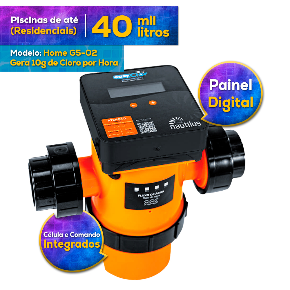 O gerador de cloro Nautilus EasyClor® Home G5-02 é indicado para o tratamento de piscinas residenciais. Desenvolvido com qualidade e alta tecnologia da Nautilus, é um equipamento que produz cloro automaticamente a partir do sal adicionado à água, através de um processo conhecido como eletrólise.