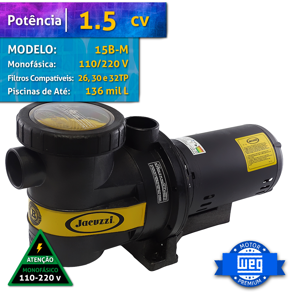 CARACTERÍSTICAS: Motobomba Jacuzzi 1.5cv Piscina Até 188000 L 15B-M 110V/220V